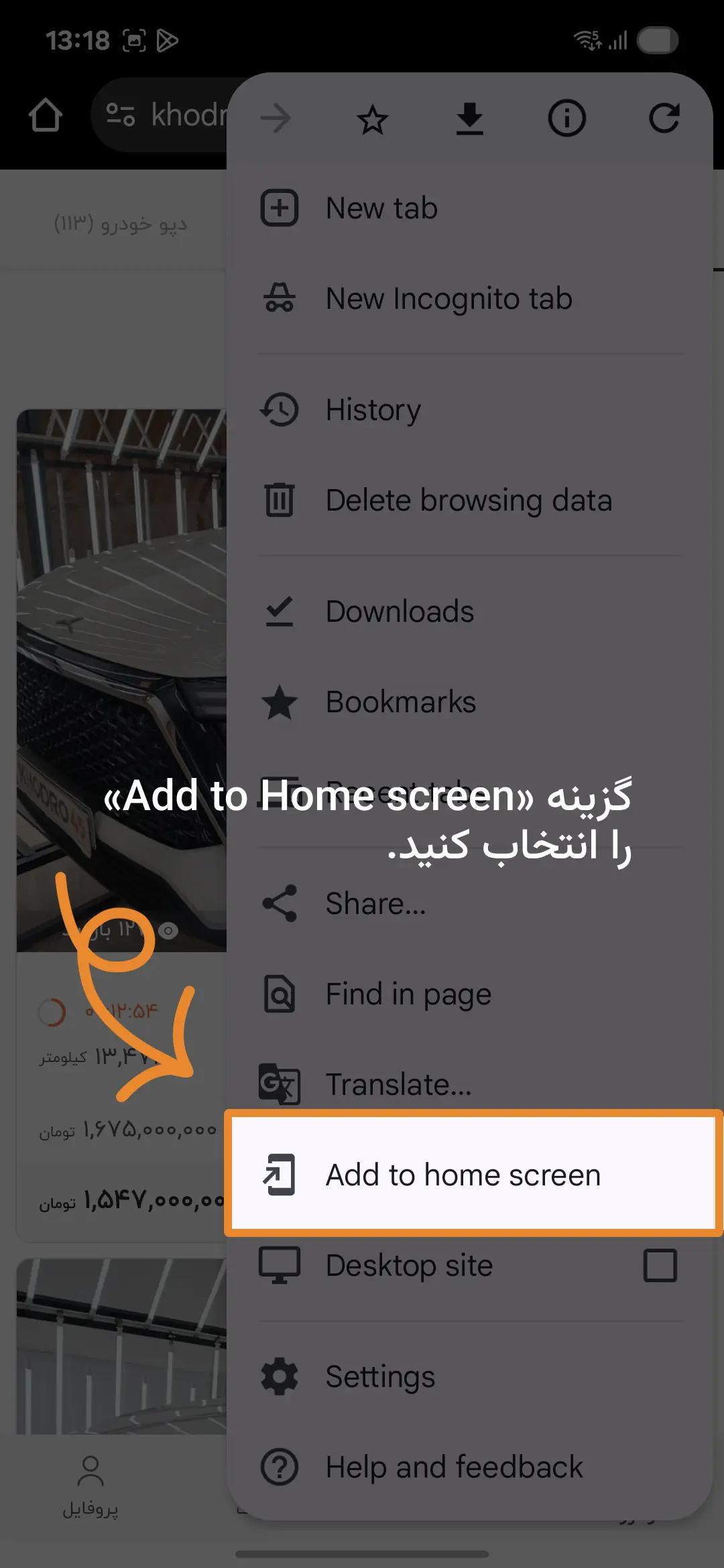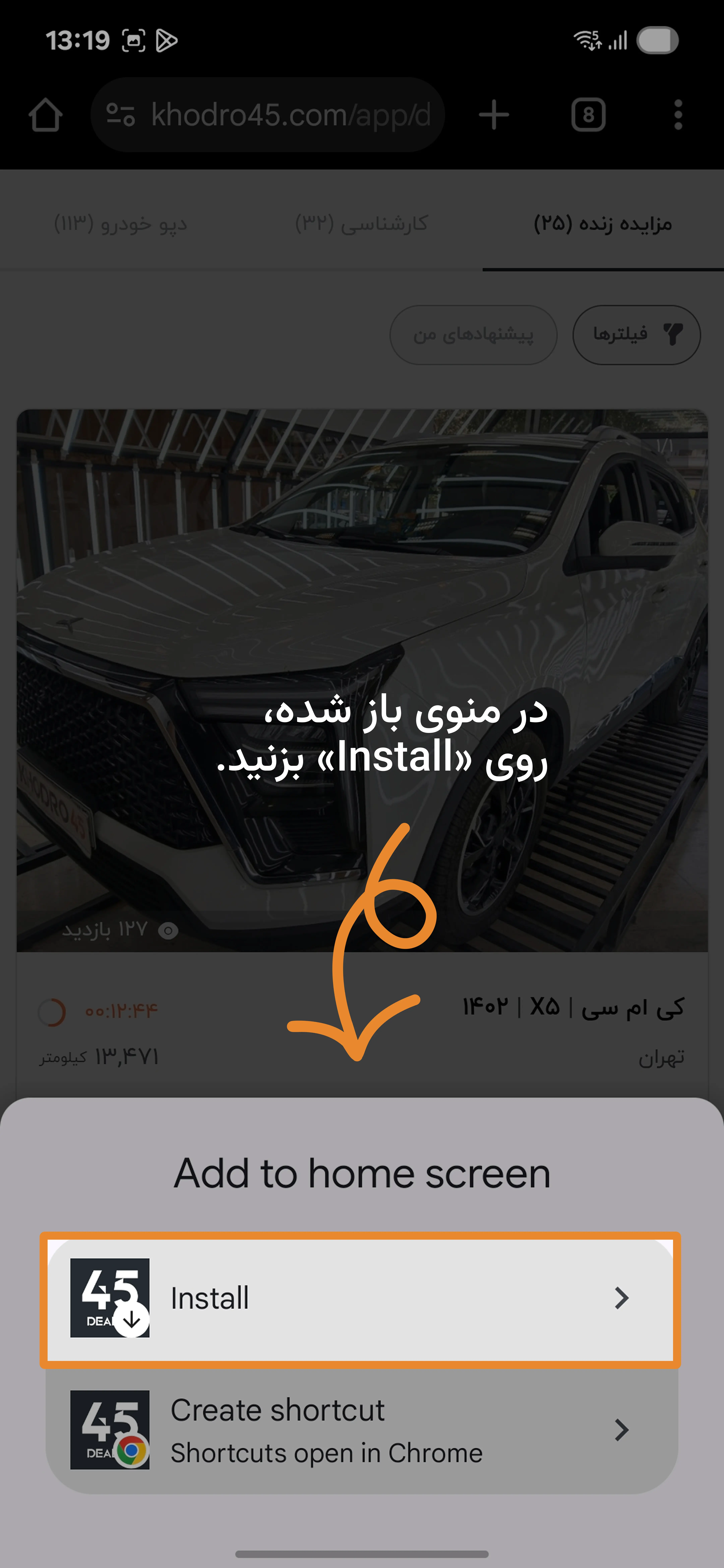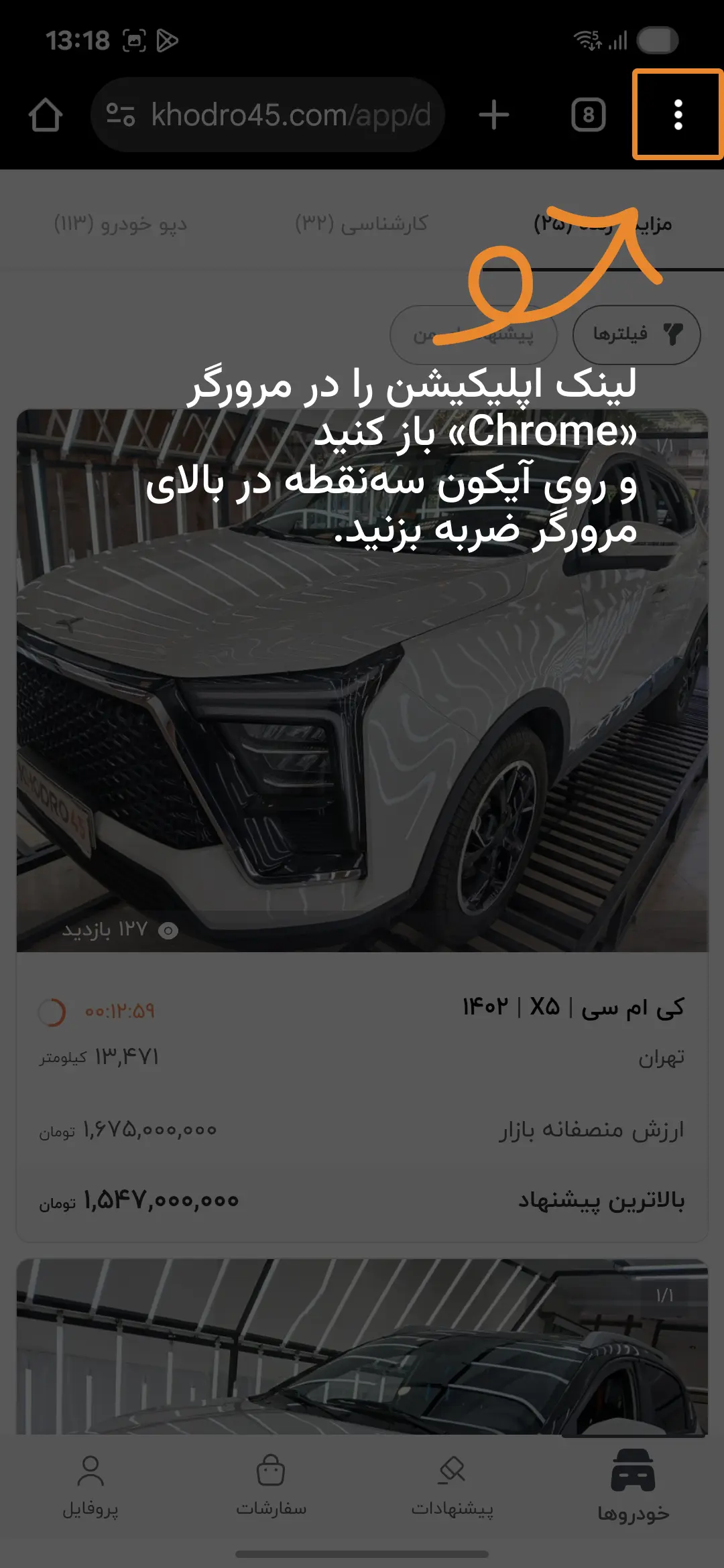 لینک اپلیکیشن را در مرورگر «Chrome» باز کنید و روی آیکون سهنقطه در بالای مرورگر ضربه بزنید.